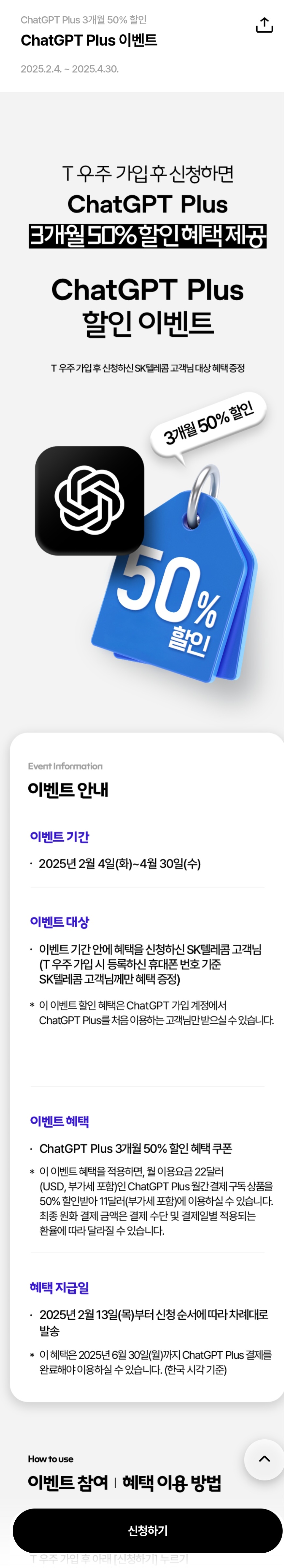 SKT ChatGPT Plus 50% 할인 이벤트 신청 방법